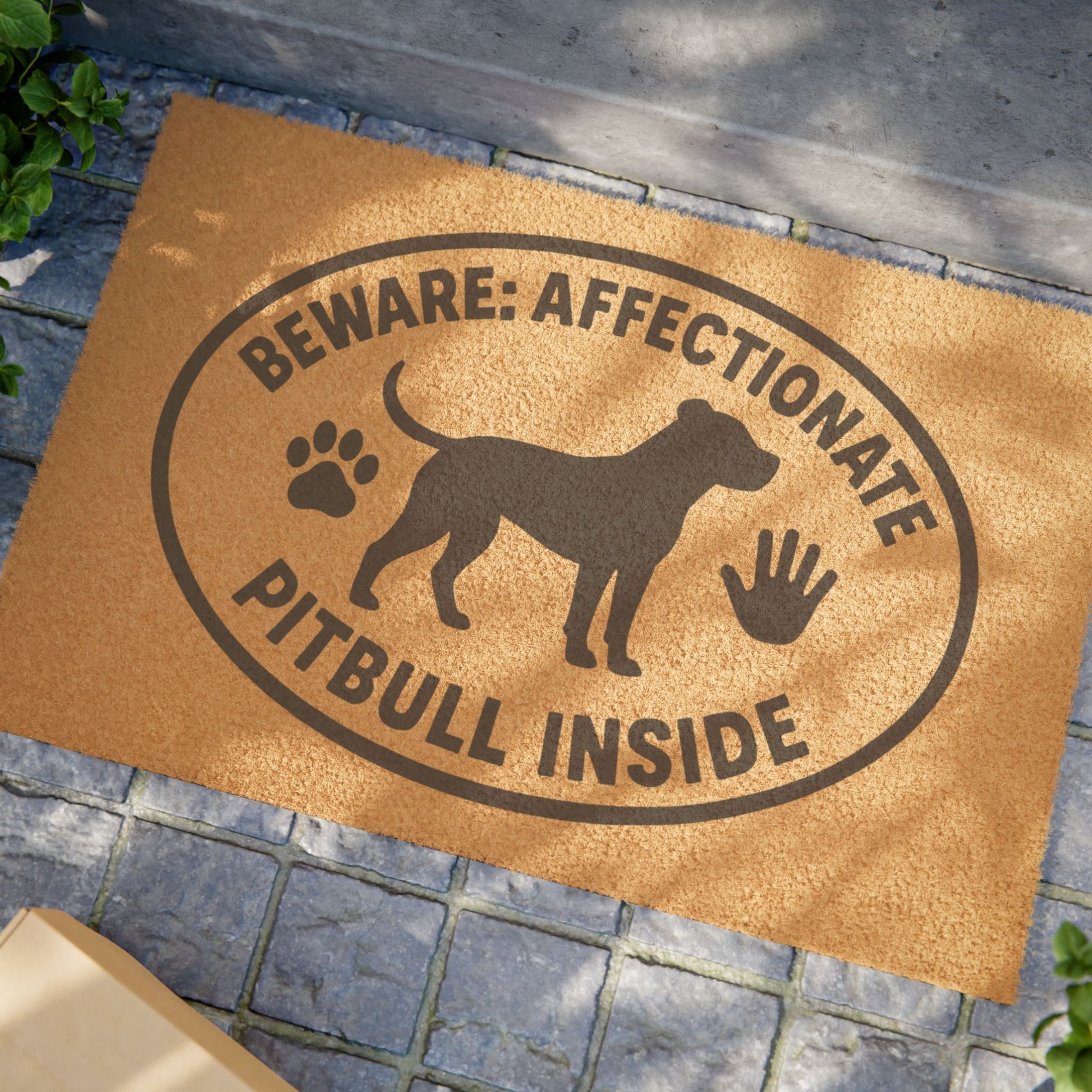 “Beware: Affectionate Pitbull Inside” Badge Doormat – Bonded Hand & Paw Edition