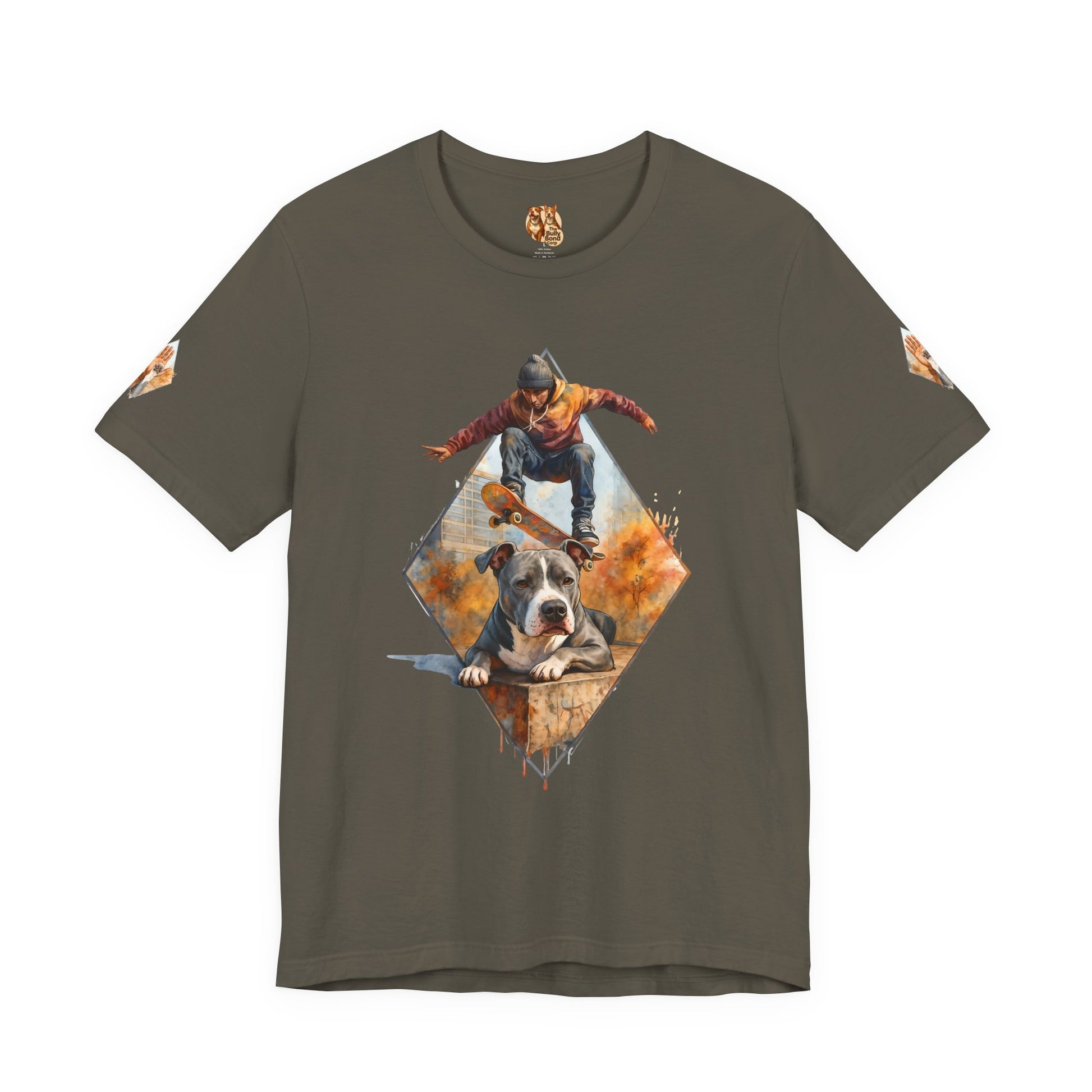 Front: A skater suspended mid-air above a calm, confident pitbull — a portrait of control, loyalty, and strength.