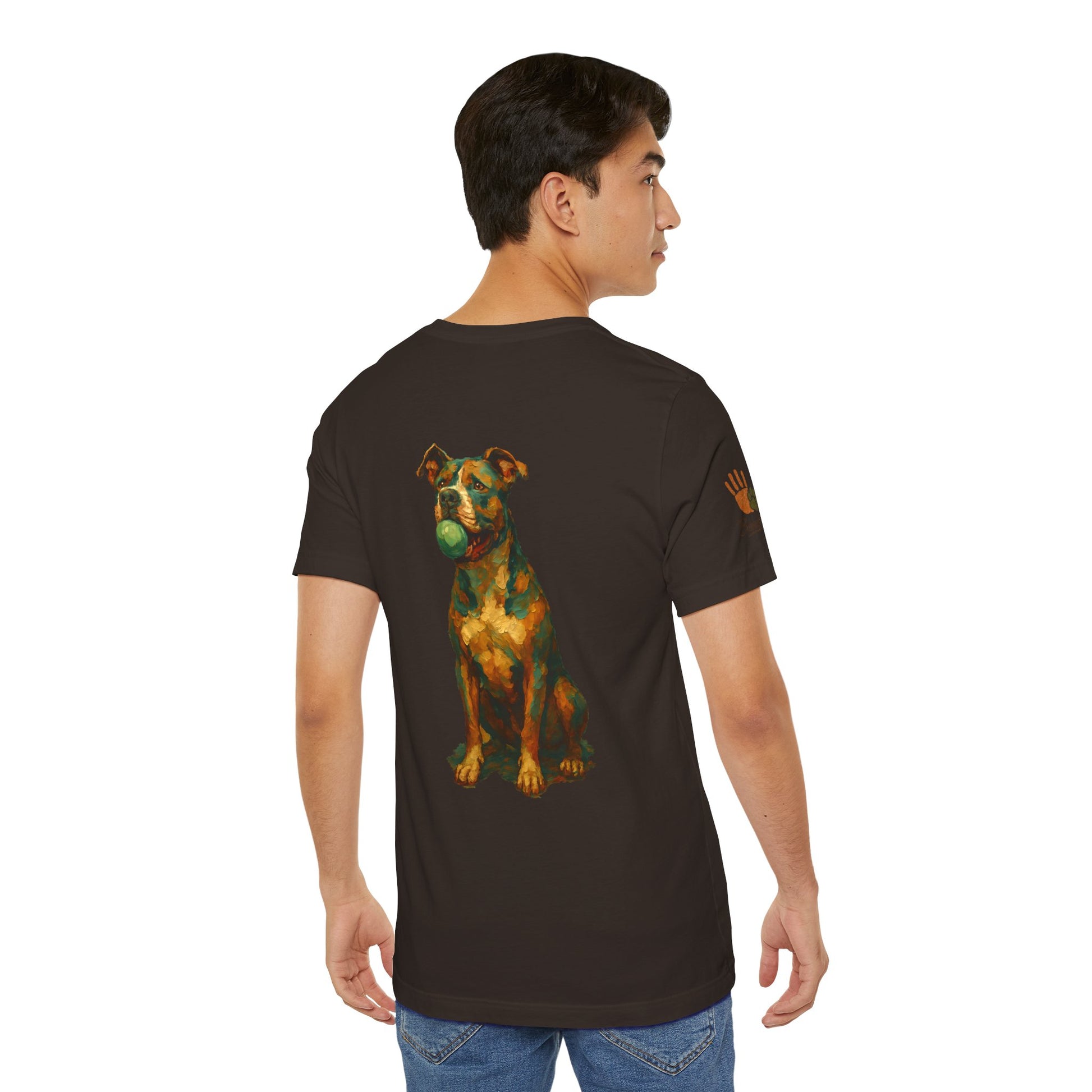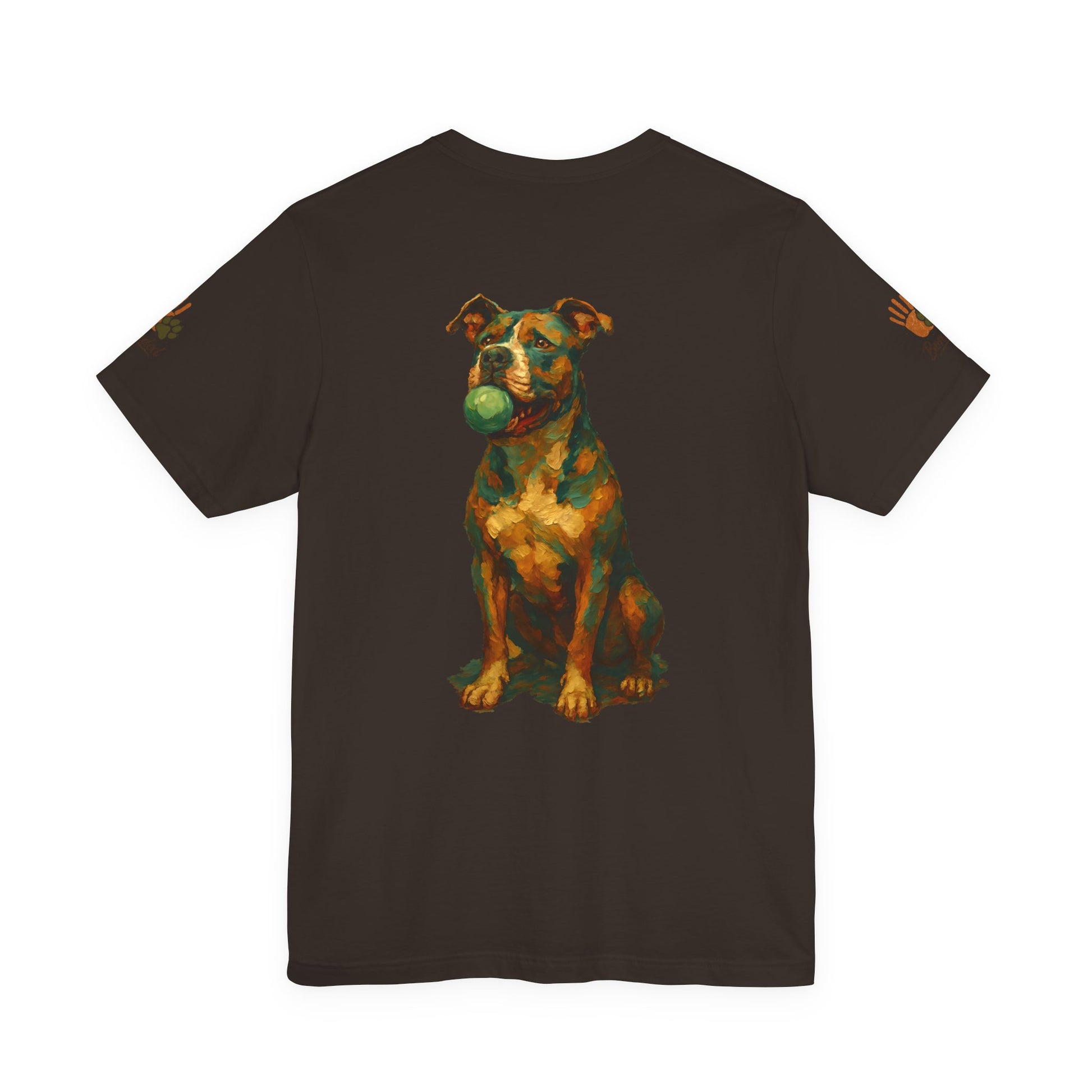 🐾 Back Design: Vibrant painted-style illustration of a loyal Pitbull with a ball, symbolizing playful companionship.