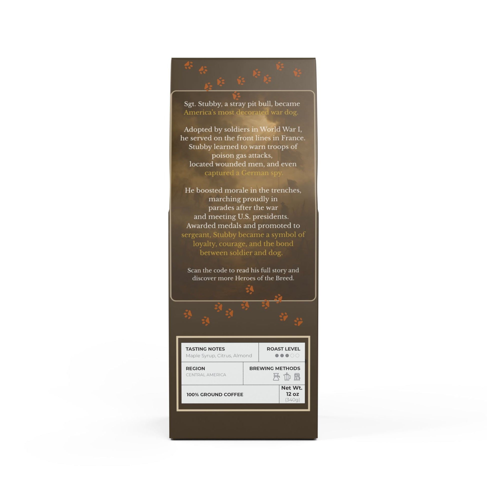 Brave in battle, loyal in heart — Stubby’s Victory Roast celebrates America’s most decorated war dog with a smooth, balanced cup. This medium roast blend of Central and South American beans delivers sweet chocolate, roasted almond, and maple syrup sweetness with a bright citrus lift and a clean finish.